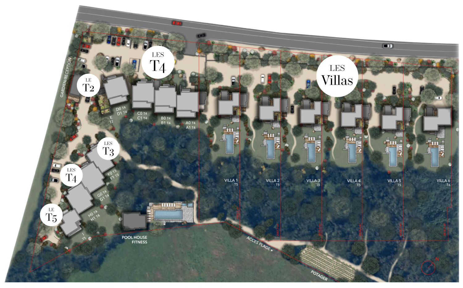 La résidence construite en 2022 offre un parti pris architectural contemporain et rigoureusement fondu dans la cadre naturel. Les villas et appartements sont composés de matériaux organiques tels que le bois prédominant, le béton brut et la pierre.